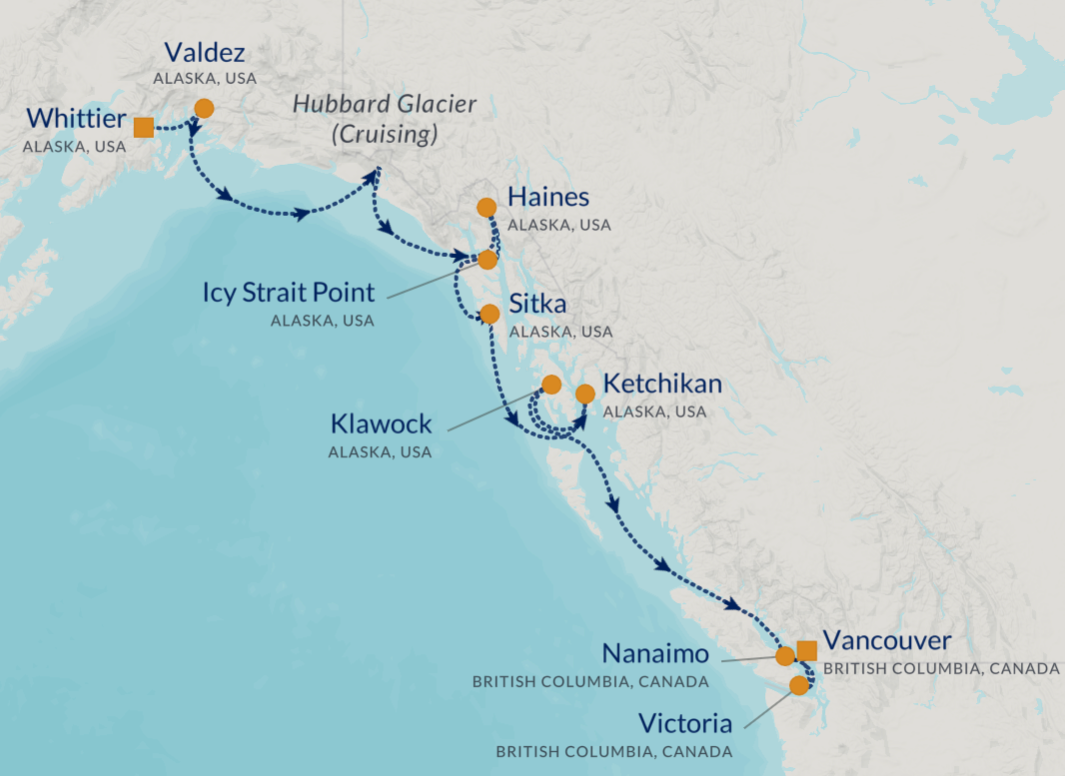 - Thu, Jul 23: Whittier, Alaska, USA - (Cruise End) - The "Town Under One Roof" (most residents live in Begich Towers). Located on the calm waters of Prince William Sound, known for the world's highest concentration of tidewater glaciers and the dramatic Anton Anderson Memorial Tunnel entrance.